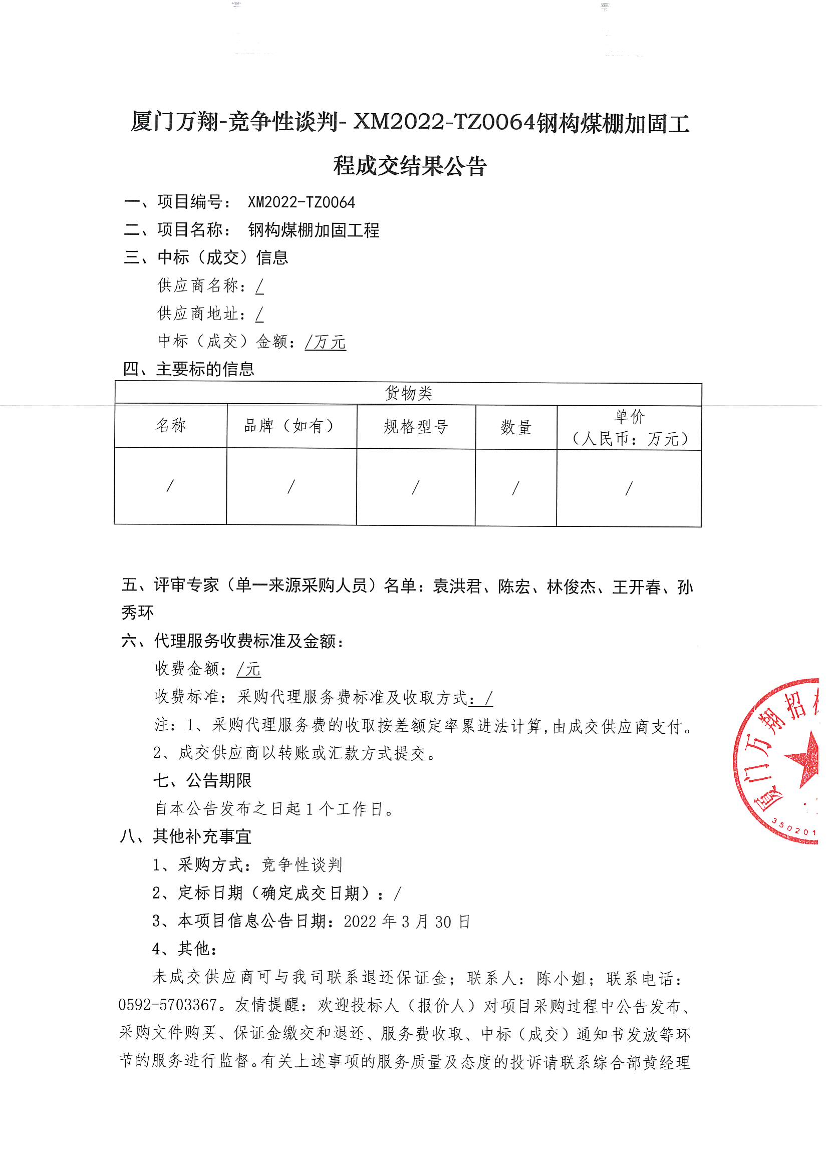 廈門萬(wàn)翔-競(jìng)爭(zhēng)性談判-XM2022-TZ0064鋼構(gòu)煤棚加固工程成交結(jié)果公告